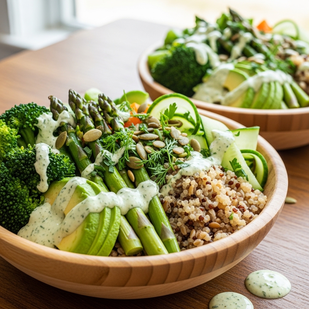 Generously drizzle your zesty Green Goddess dressing over everything—it’s like giving your bowl an extravagant spa day! Toss gently if you’re feeling fancy or leave it layered for visual impact.