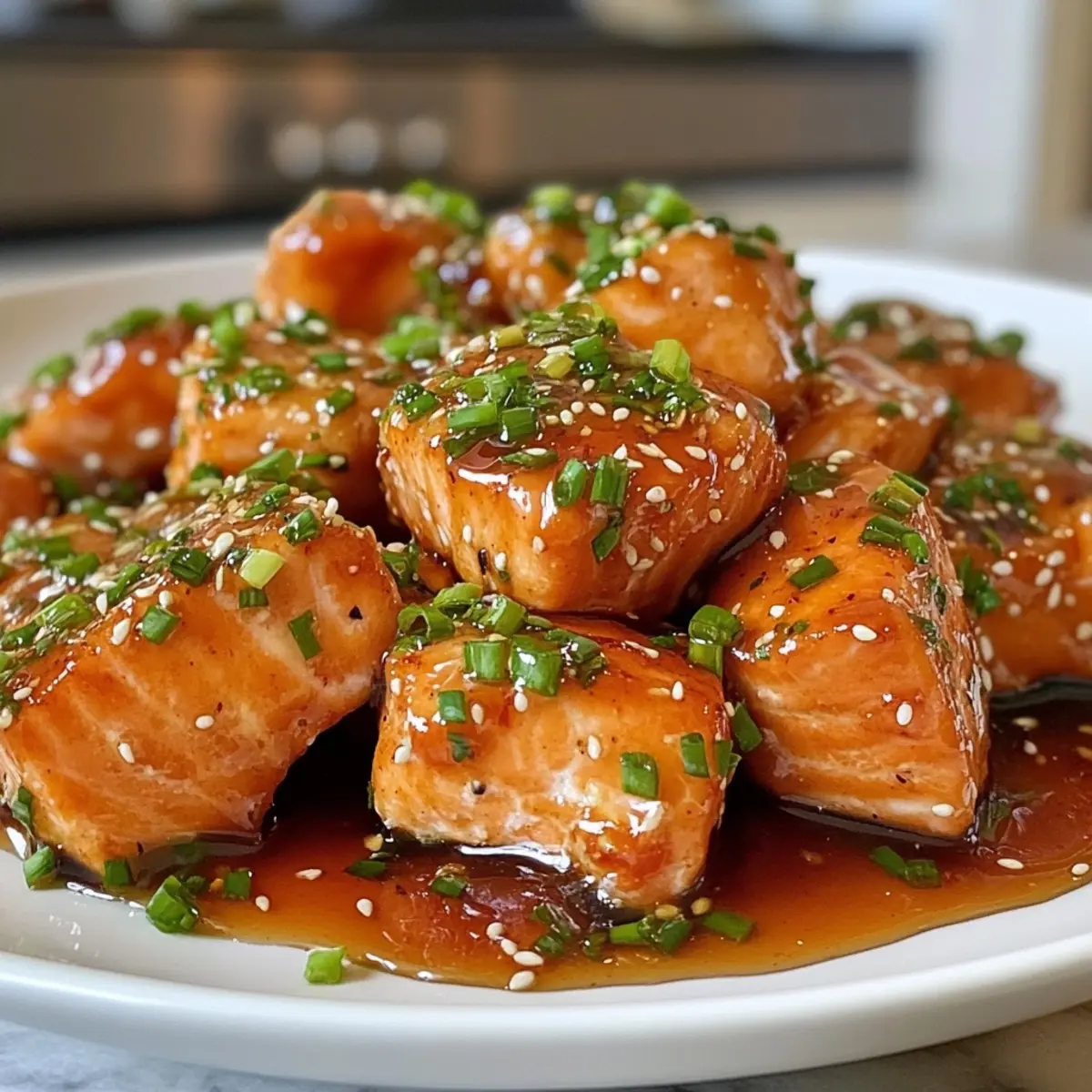 - Add the Sauce: Drizzle sauce over crispy salmon bites and toss gently to coat. Serve warm.