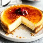 When you’re ready to serve, sprinkle granulated sugar evenly across the top of your chilled cheesecake. Using a kitchen torch (or broiler), carefully melt the sugar until it bubbles and turns golden brown—watch closely as it can go from golden perfection to burnt in seconds!