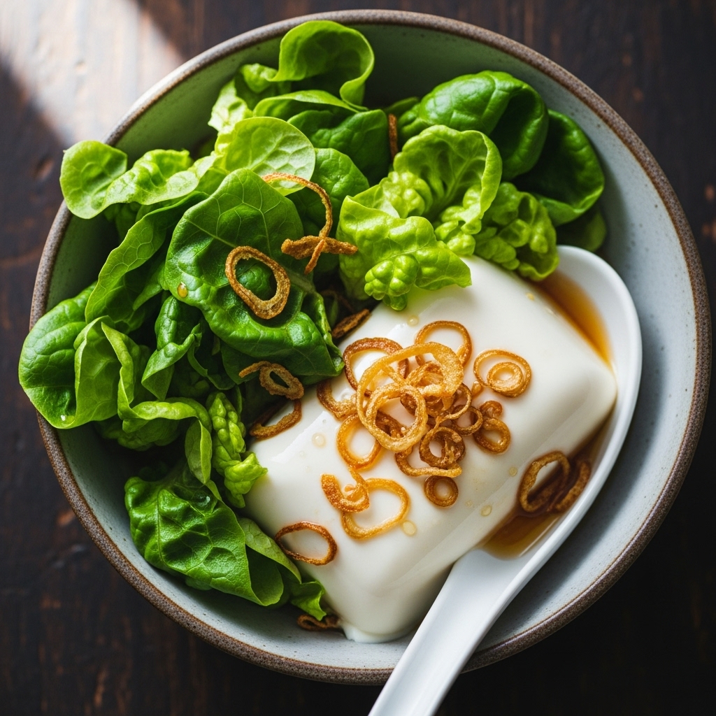 Silken Tofu With Crunchy Lettuce & Fried Shallots Delight