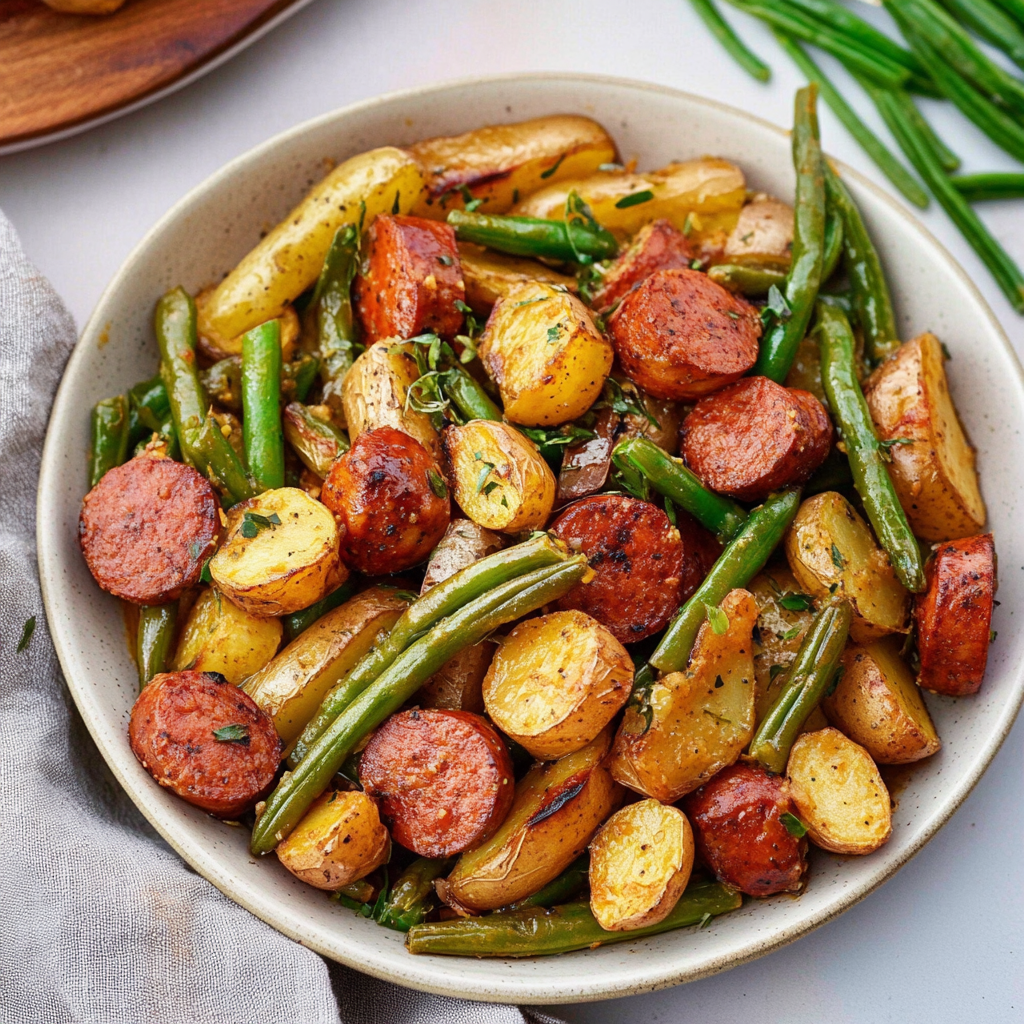 Easy Sheet Pan Kielbasa with Sweet Potatoes & Green Beans