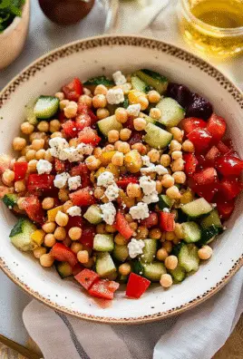Start by prepping your ingredients: chop veggies, rinse chickpeas, and crumble feta. Combine everything in a large bowl and dress it just before serving to keep it fresh and crisp. This sequence saves time and ensures every bite bursts with flavor.