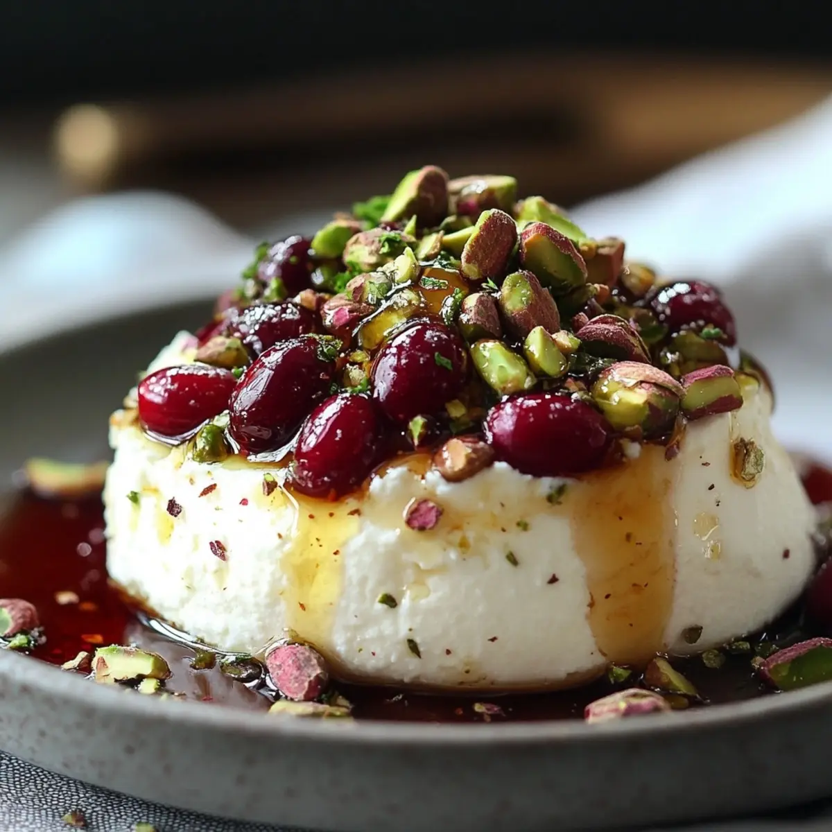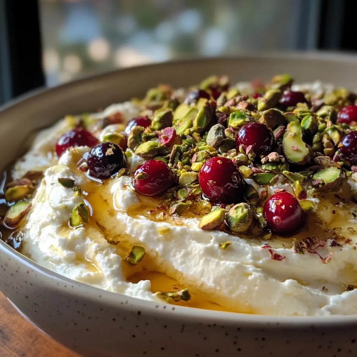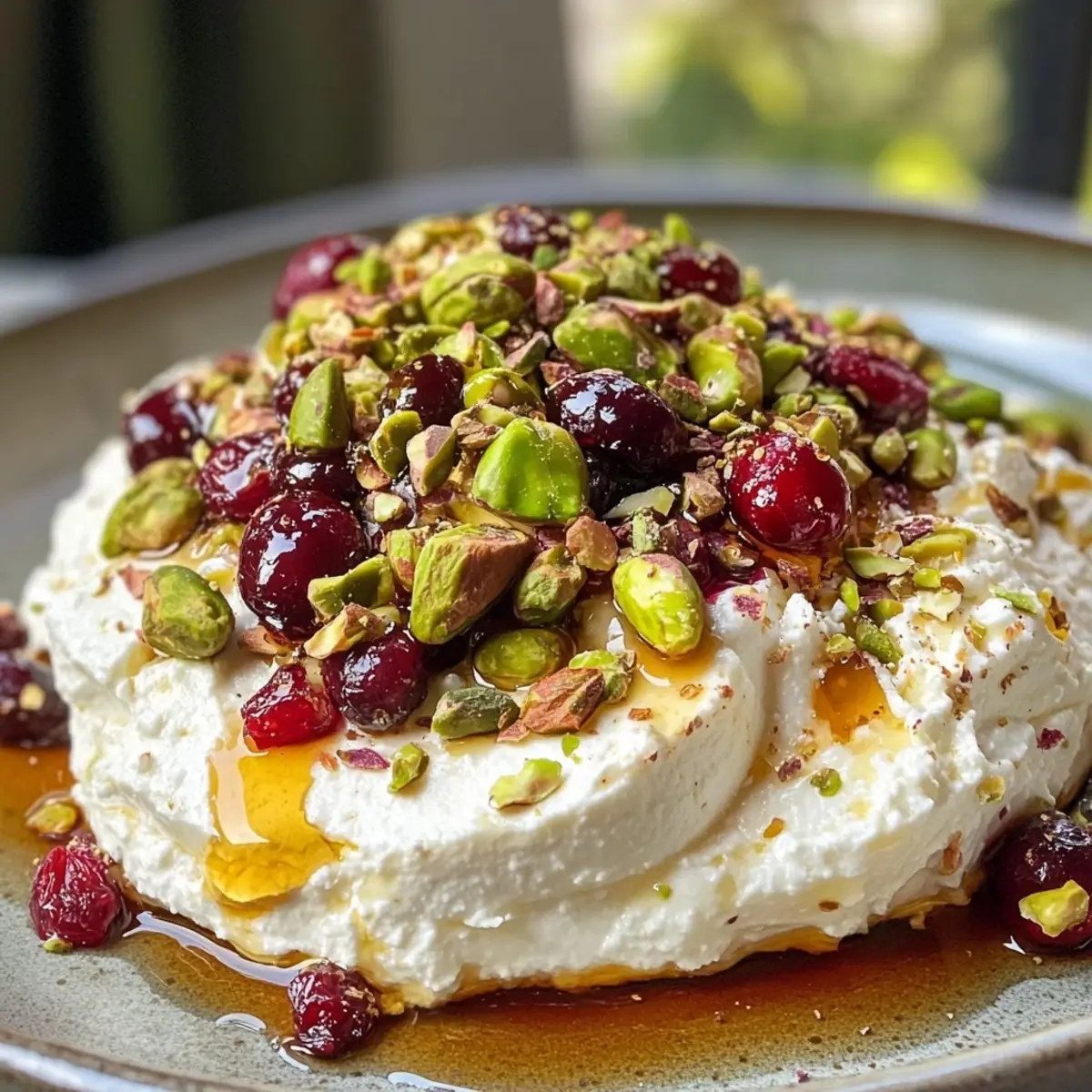 - Spread the whipped feta mixture onto a serving plate, creating shallow wells for the toppings. Drizzle the warm honey generously over the dip, then sprinkle with toasted pistachios and dried cranberries. Finish with a pinch of black pepper or your choice of optional spices.